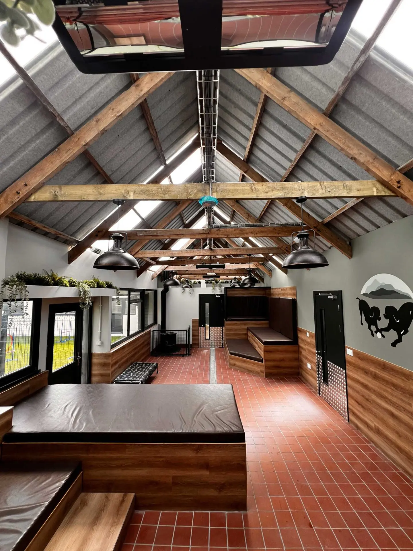 “A homely, welcoming space with cosy bespoke dog sofas, a wood-burning stove, dedicated nap-time rooms, and plenty of indoor and outdoor play areas. We’ve even added a dog wash station—being on a farm, I know how important it is that your dog doesn’t come home muddy!”